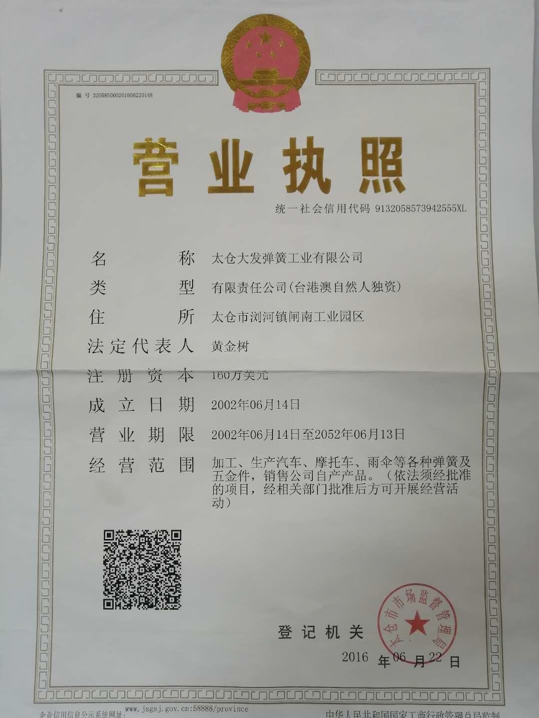 太倉大發彈簧工業有限公司由黃金樹先生于1967年始創于臺灣,是一個集雨傘、電子、五金機械、自行車、摩托車、汽車等的彈簧配件生產、加工、輔助設計服務的綜合性企業,其中1990年創辦的廈門大發彈簧公司、2000年創辦的深圳大發彈簧公司、2002年創辦的太倉大發彈簧公司均位于經濟發展地區,地理位置佳。我們憑借在彈簧制造業的多年豐富知識與技術,并著眼于以客戶為導向,秉持“以人為本,以質為先,以客為主,持續創新”的經營理念,強化競爭優勢。公司導入ISO9001: 2000質量管理體系,執行ISO14000:2000管理方式,倡導安全、高質量、高素質的生產。